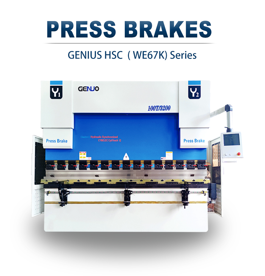 GENUO Genius HSC series CNC press brake adopts integral processing and tempering ultra-high strength frame. The CNC control system can independently and accurately control Y1 and Y2 axes to make the ram run synchronously.The advanced servo proportional valve ensures high bending accuracy and stability through real-time feedback of grating ruler. Large stroke and daylight combined with multi axis optional high-precision back guiding rule system can realize more flexible bending size and angle.The multi-functional CNC control can automatically calculate the pressure, crowning and unfolding size according to the length and thickness of the workpiece.